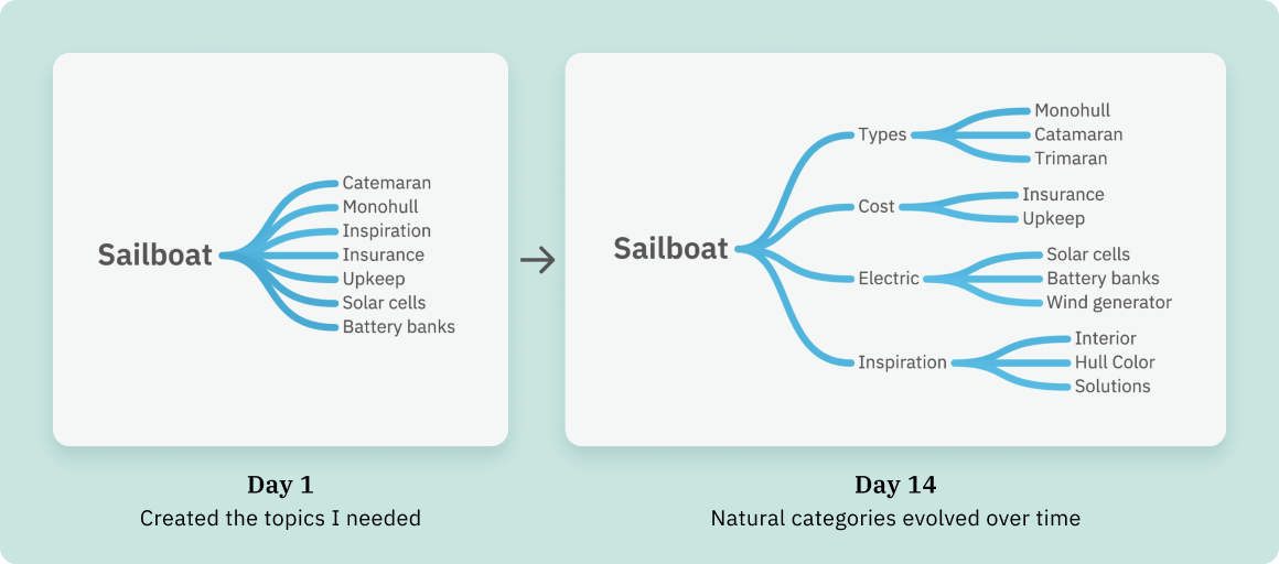 Topics are easy to move around in your knowledge tree, so it's no trouble to refine your breakdown later and let it evolve over time. As an example, you can see how my branch on sailboats changed during the two weeks I researched the topic: