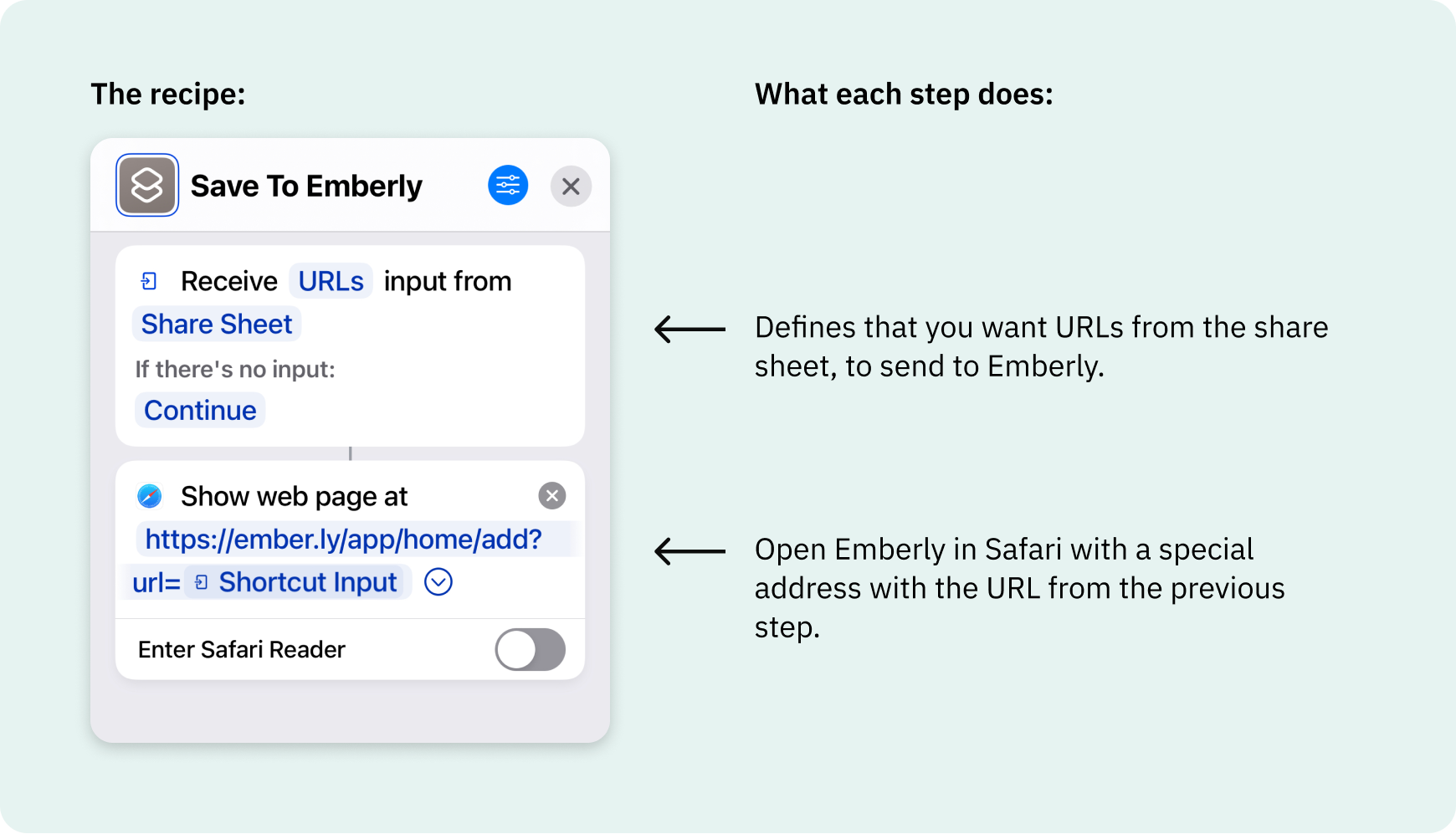 However, there is an easy and quick way to circumvent this limitation with your iPhones built-in Shortcuts app. This app allows you to create all sorts of nifty automation on your iPhone. And by setting up an automation in this app, you can start sending links directly to your Emberly Inbox.