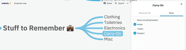 A packing list branch, often dubbed "Stuff to Remember," can be useful because it helps you visualize what you need to bring and where you will be packing it.