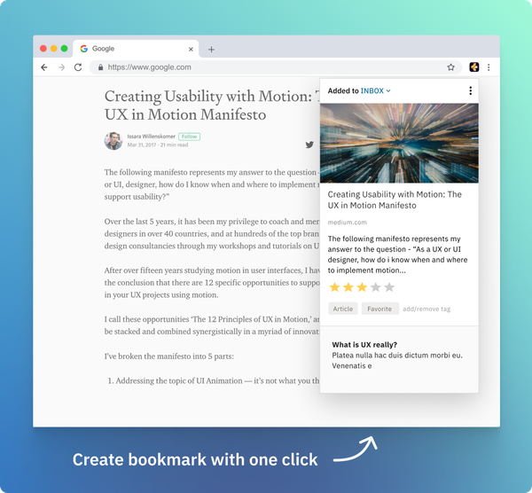 After installing the extension, click the Emberly icon to save the current website. The web clipper then immediately saves the website to your Inbox. You can then change the location, write notes, and add tags — if you want to.